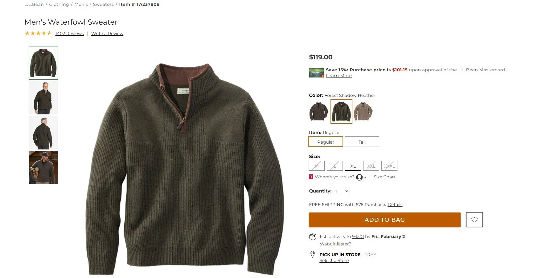 Merino is a specific type of wool taken from a select group of sheep and since you can’t harvest as much volume as normal wool, it’s often much more expensive. The upside is that you’re getting a much higher quality fabric—it’s much softer and significantly warmer too. The thing I love about L.L. Bean is that it’s priced at a very generous $120. While this certainly isn’t cheap by any means, it is completely worth it for the product you’re getting. If you scour the internet for this kind of item (made specifically of this wool), you’re likely to get results that are significantly more expensive. So if you’re planning on investing into a knit sweater, I’d put this in as a good contender: lots of versatility and immensely useful.